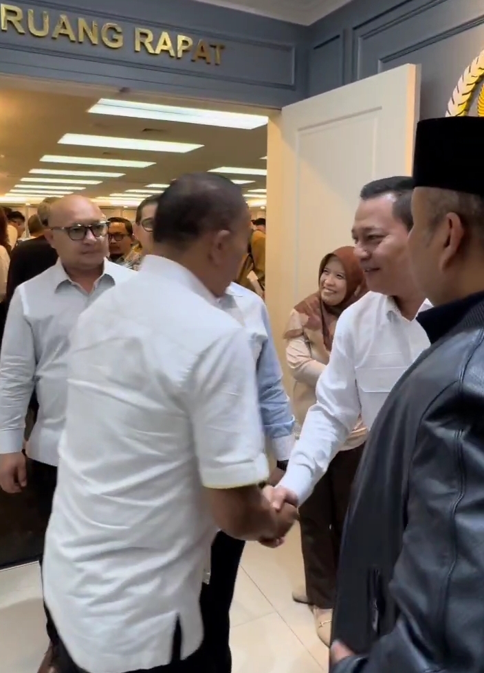 Maruli Siahaan berjabat tangan dengan Direktur Intelijen Pemasyarakatan Kementerian Imigrasi dan Pemasyarakatan Tatan Dirsan Atmaja saat Rapat kerja di Gedung Nusantara 2 Lt 3 DPR RI, Selasa (28/10).(ist)