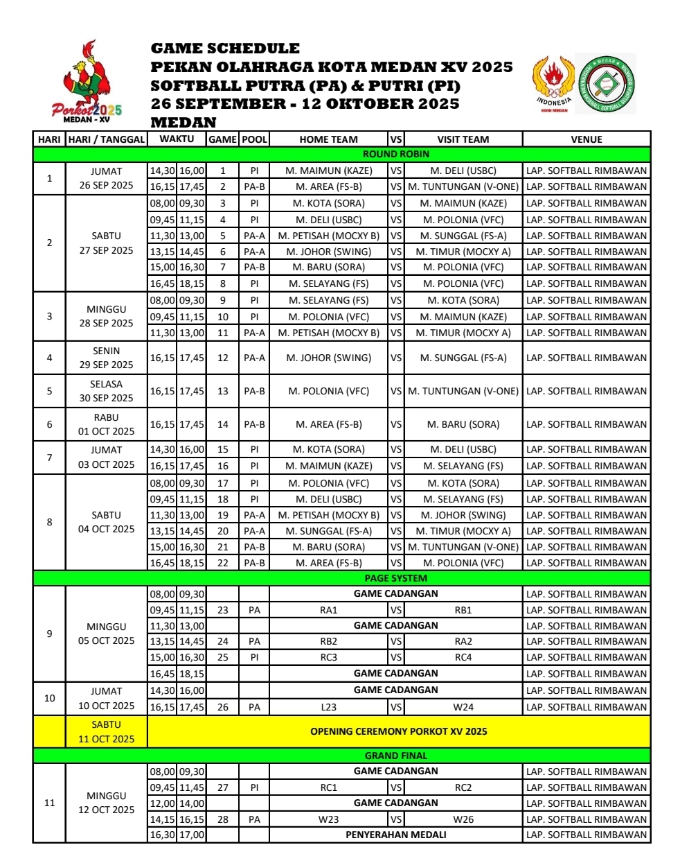 Tim SoftballPutri Kecamatan Medan Kotadipimpin oleh sang kapten, Tri Teguh Mahdata, tim Medan Kota tampil solid sejak awal. Kemenangan pertama diraih saat berhadapan dengan tim Medan Maimun dengan skor meyakinkan 11–3. Laga berikutnya kembali memperlihatkan dominasi Medan Kota setelah menundukkan Medan Selayang dengan skor telak 13–0. Pertandingan ketiga berlangsung sengit, namun Medan Kota berhasil memastikan kemenangan tipis 6–5 atas Medan Deli.
