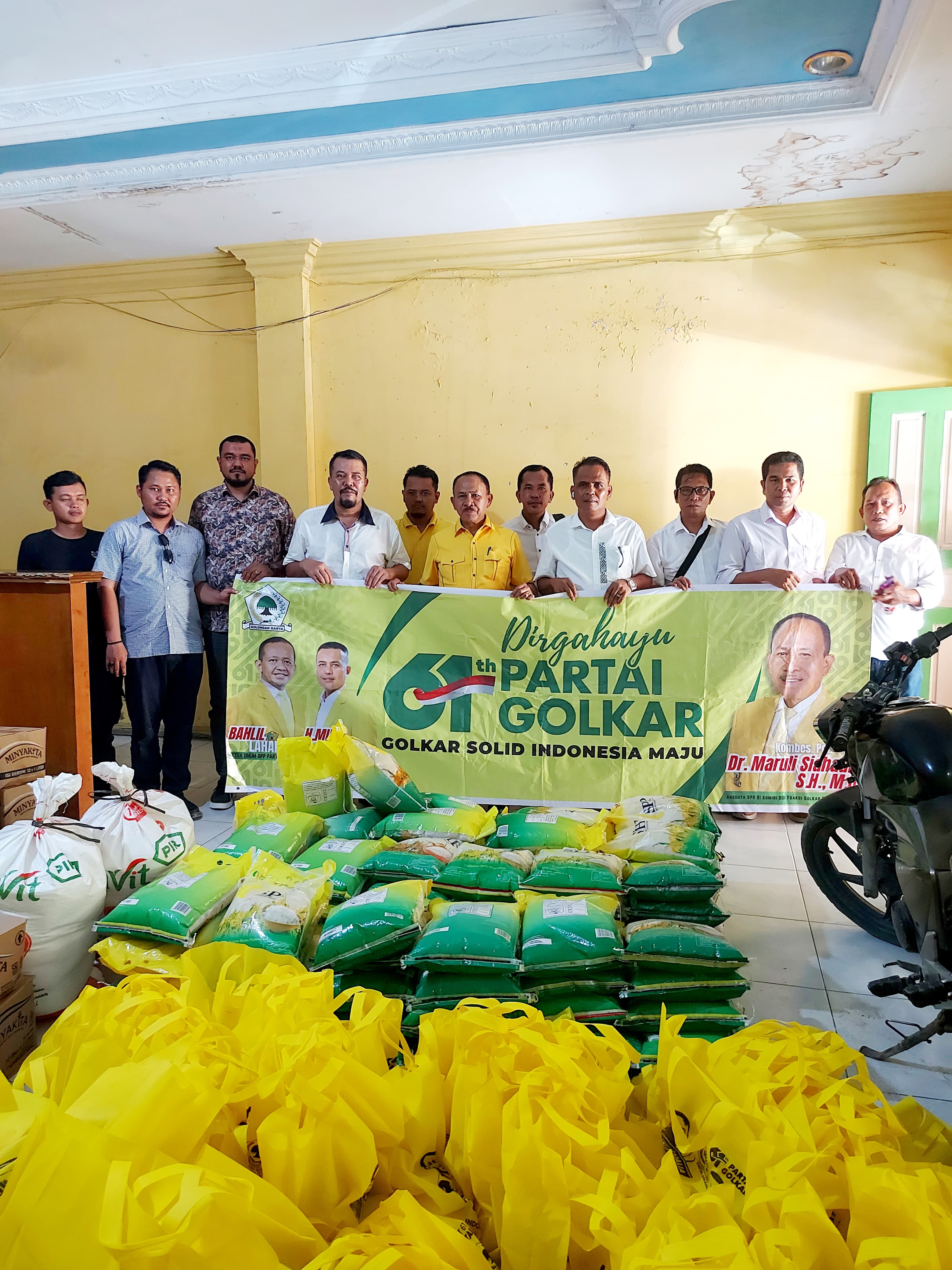 Pemberian sembako itu dalam rangka HUT ke 61 Partai Golkar, di kantor DPD Partai Golkar Jl. Kabupaten No.51, Simpang Tiga Pekan, Kec. Perbaungan, Kabupaten Serdang Bedagai, Sumatera Utara.