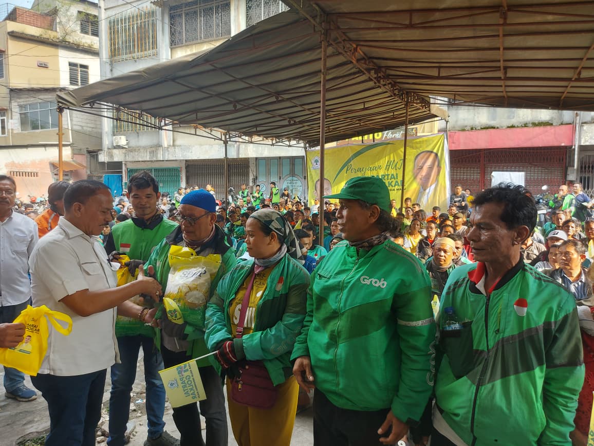 Medan, MPOL: Sedikitnya 500 paket sembako dibagikan anggota DPR RI Komisi XIII Partai Golkar Kombes Pol. (Purn.) Dr. Maruli Siahaan S.H., M.H kepada Driver Ojek Online, Supir Angkot, Supir Becak dan Pemulung, Selasa (14/10).