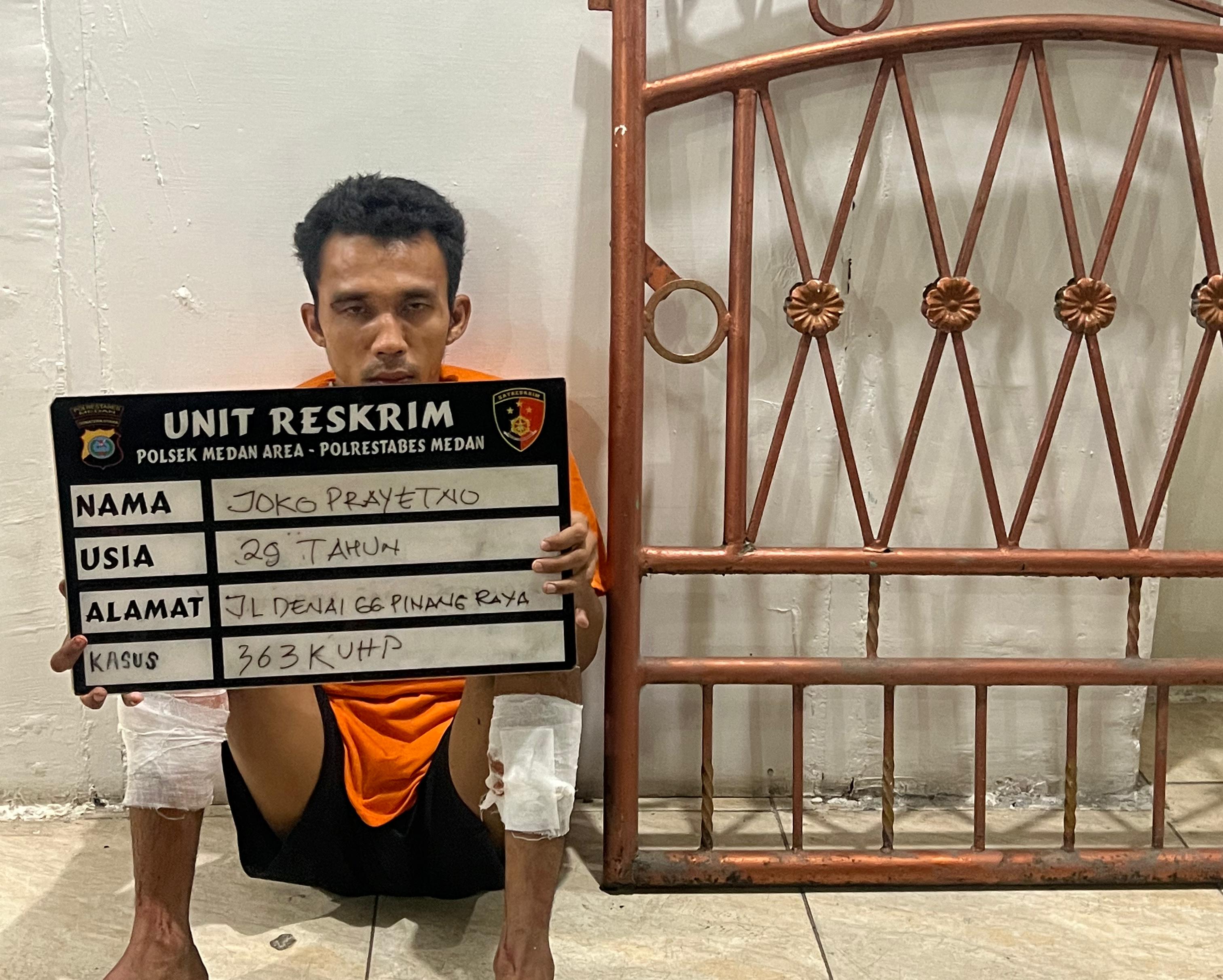 Berdasarkan hasil cek TKP dan keterangan saksi-saksi serta petunjuk dari cctv, petugas kemudian mencari keberadaan pelaku. Alhasil, satu pelaku atas nama Joko Prayetno alias Kakek (32) warga Jalan Denai, Gang Pinang Raya, berhasil dibekuk petugas di Jalan Denai sekitaran simpang Jalan Mandala Bypass, Senin (20/10/2025) sekira pukul 22.00 WIB.